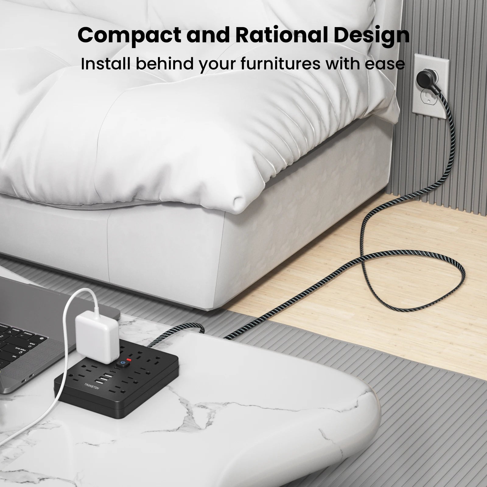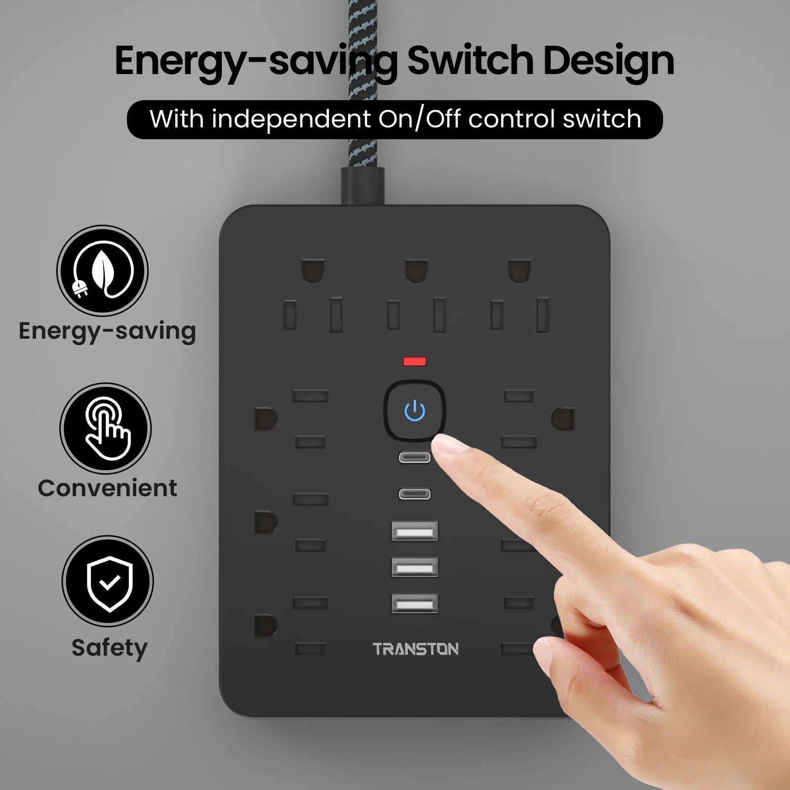TRANSTON power strip surge protector with 9 Ac Outlets,3 USB & 2 USB-C,5ft Cable,Weaving thread,45° tilt plug,Black