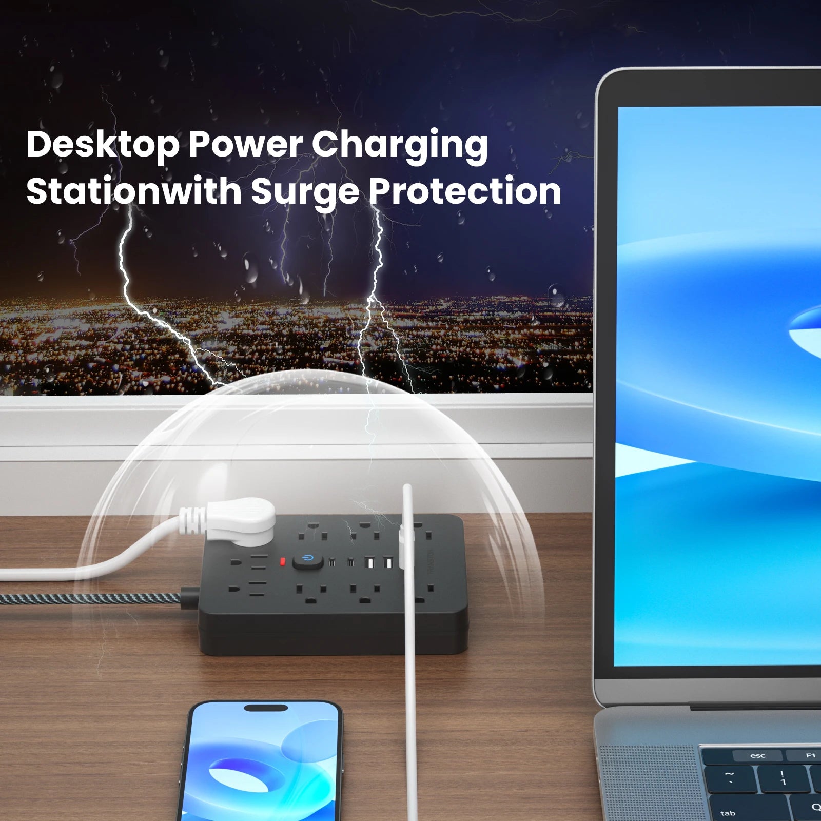 Keep all your devices powered and protected with the TRANSTON Power Strip Surge Protector. With 9 AC outlets, 3 USB ports, and 2 USB-C ports, it’s perfect for home, office, or gaming setups, allowing you to charge multiple devices simultaneously.